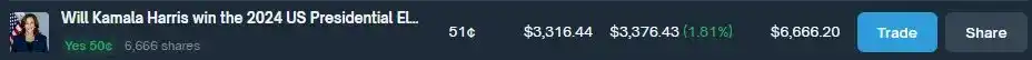 這個策略相當直接:一邊押注卡瑪拉·哈里斯贏得總統大選,一邊買入共和黨在選舉人團中所有可能的勝選差距。實質上,這兩類部位彼此對沖。如果兩邊部位的總價格低於 1,那麼差值部分就是可以鎖定的收益率——也就是套利空間。截至今天,這筆交易的套利幅度為 3.5%,距離大選還有 41 天。換算成年化,大約相當於 41% 的年化報酬。