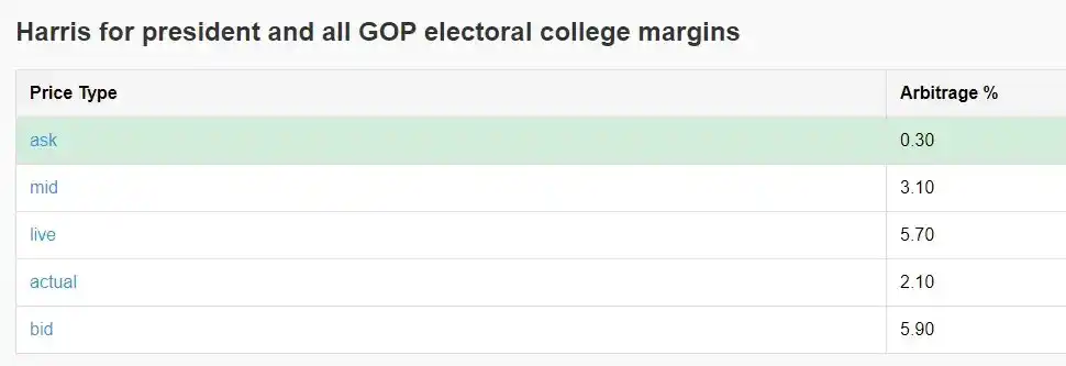 套利 1:買入「哈里斯當選總統」並同時買入所有「共和黨贏得不同選舉人票差距」的結果
