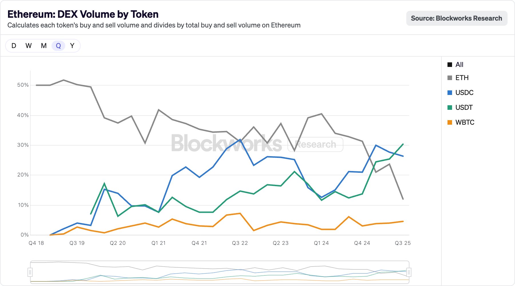 图片说明:Ethereum DEX Volume by Token;来源:@blockworksres