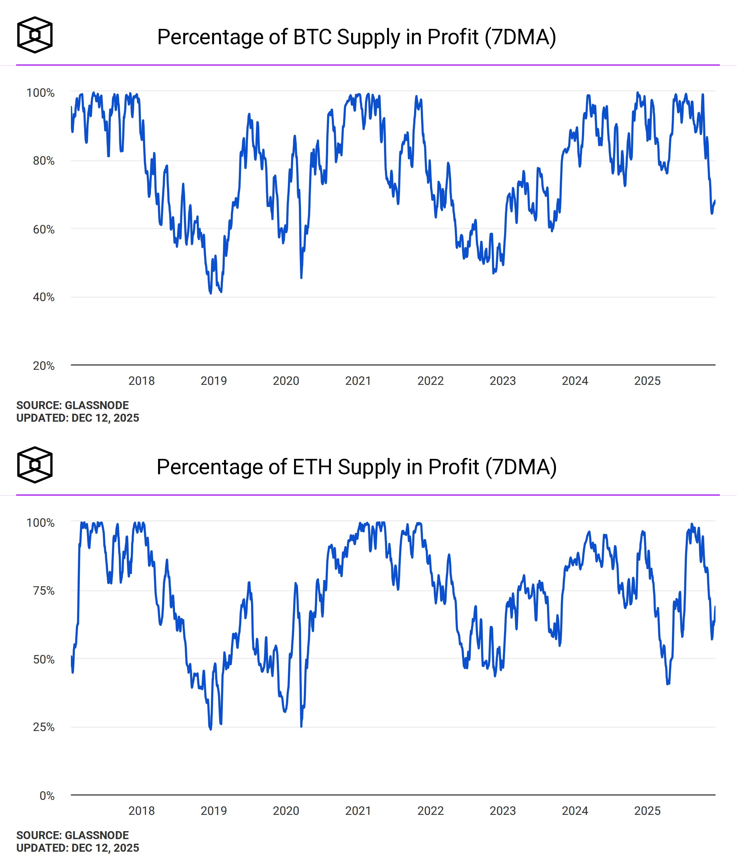 图片说明:BTC 和 ETH 地址盈利;来源:@TheBlock__