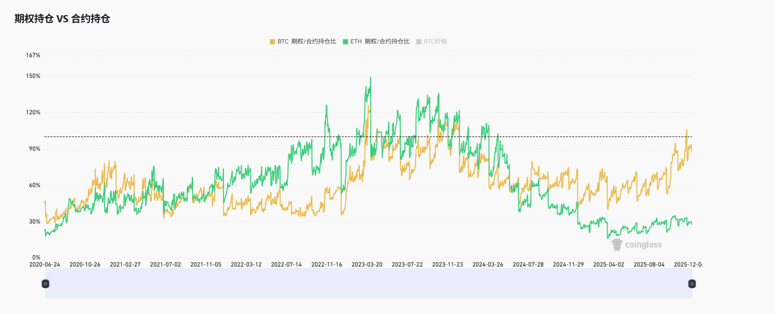 另一个数据就比较有意思,加密期权/加密合约持仓比的数据显示,BTC的期权占比自今年以来一路飙升,最高时甚至突破了100%,目前的比值也维持在90%左右。而在此之前,BTC的期权占比长期维持在60%左右。也就是说,当前的BTC市场,已经由期货合约主导,完全转向了期权合约主导。不过,ETH的加密期权/加密合约持仓比却在今年降至极低的水平线上,约为30%。