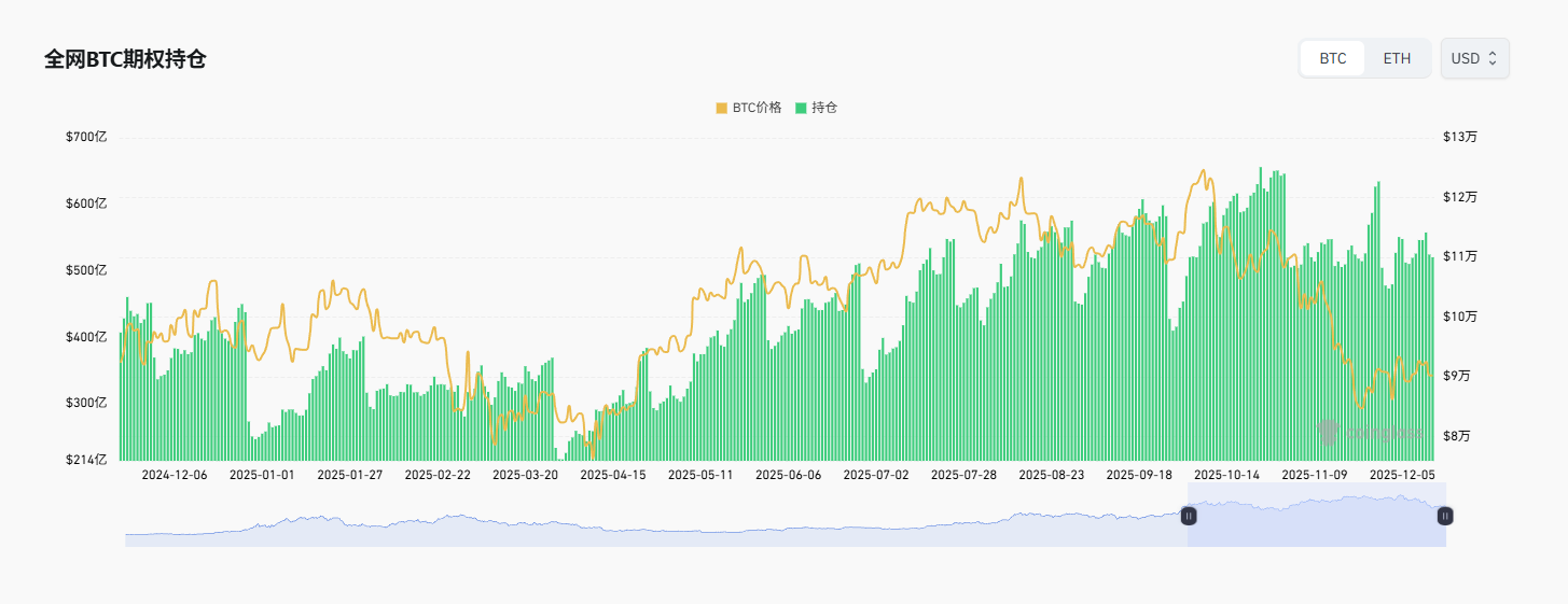 这个数据的背后,印证了两个问题。一个是BTC市场的主导权已经彻底被机构和对冲基金掌握,而ETH及其他山寨币似乎不再是这些机构和对冲基金的交易选项。另一个关键在于,在预测BTC市场方面,期权市场数据则变得更为重要。从BTC的期权持仓总量上我们也能看到这种趋势,即便价格下跌,期权持仓量仍处于高位。