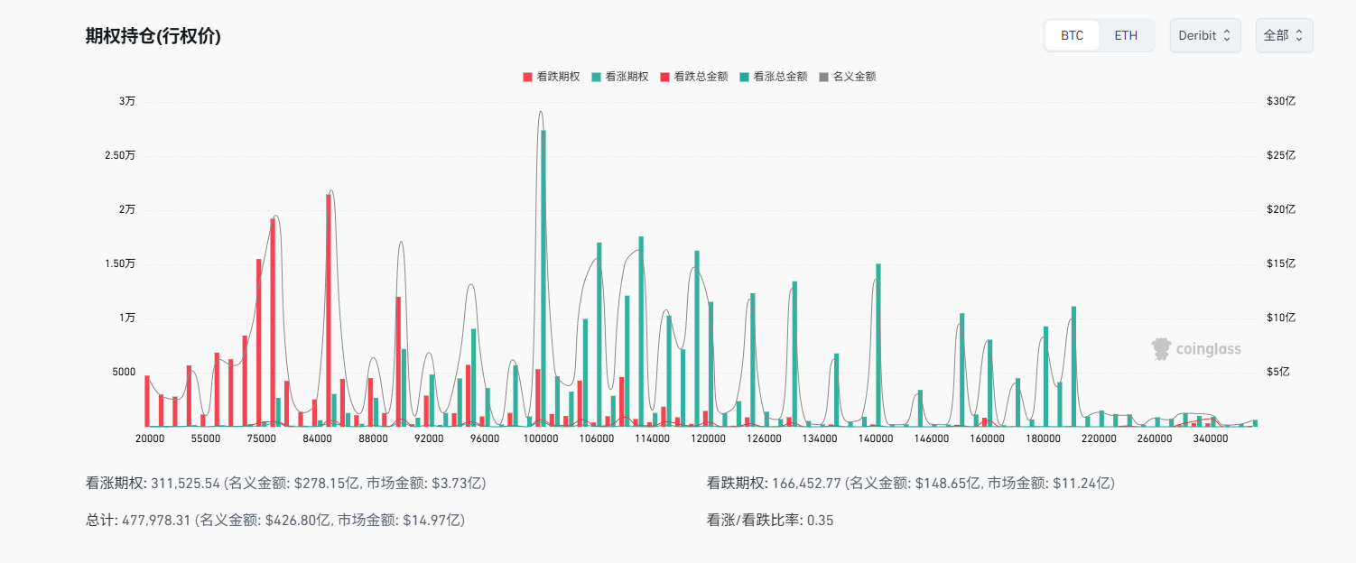 再结合期权行权价的分布,我们能够看到大多数的看涨期权分布都在10万美元的价格之上,这也导致这些期权在12月26日行权的可能性非常小。因此这些看涨期权虽然数量庞大,但更偏向于“买彩票”式的投机目标。而大量的看跌期权的行权价都集中在85000美元及以下的位置。同时,看跌期权的市场金额达到了11.24亿美元,而看涨期权的市场金额则只有3.73亿美元(投资者购买期权所花费的权利金)。总结来说,就是虽然看涨的人数较多,但实际上更多的资金(约为75%)都在下注下跌或者防守下跌。