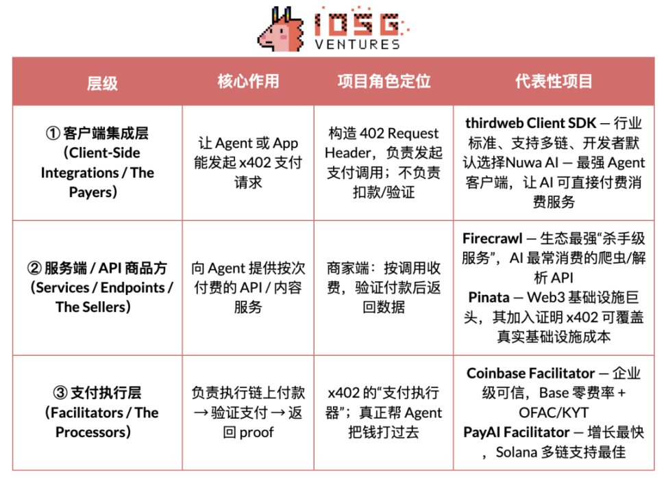 x402 原生支付生态可分为四个层级:客户端(Client)、服务端(Server)、支付执行层(Facilitators)以及区块链结算层。 客户端 负责让 Agent 或应用发起支付请求; 服务端 按次向 Agent 提供数据、推理或存储等 API 服务; 支付执行层 完成链上扣款、验证与结算,是整个流程的核心执行引擎; 区块链结算层 则承担最终的代币扣款与链上确认,实现不可篡改的支付落地。
