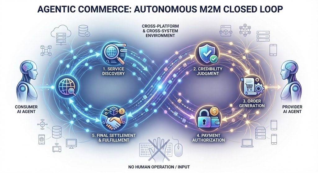 智能体商业(Agentic Commerce) 指的是由 AI 智能体自主完成服务发现、可信度判断、订单生成、支付授权及最终结算的全流程商业体系。它不再依赖于人类逐步操作或信息输入,而是由智能体在跨平台、跨系统的环境中自动协作、下单、支付与履约,从而形成机器与机器之间自主执行的商业闭环(M2M Commerce)。