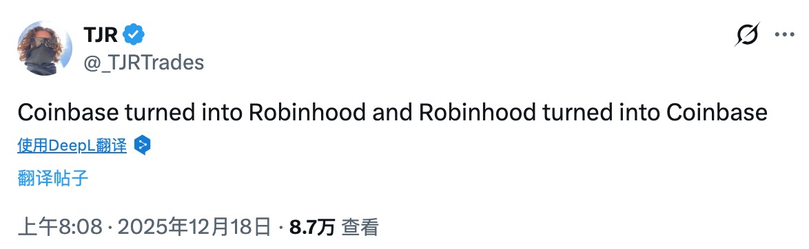 当然,对于这一战略转向,业界也发出了不同维度的评价。去中心化理念的坚持者对此表示 疑虑 ,认为此举偏离了 Crypto 的初衷。也有市场观察者从行业演进的角度指出,金融科技服务的边界正日益模糊——「 Coinbase 正在变成 Robinhood,而 Robinhood 也在变得更像 Coinbase 」。