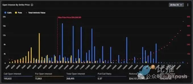 衍生品市场的结构也在一定程度上解释了比特币为何在圣诞周显得格外克制。本周五,比特币市场将迎来历史上规模最大的期权结算,总价值高达 240 亿美元。目前多空双方正在关键价位展开激烈博弈: