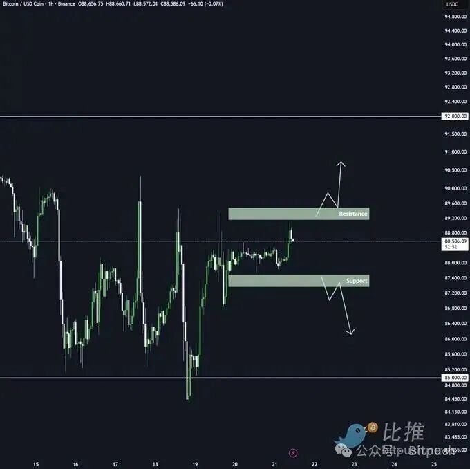 从技术结构来看,比特币当前的走势并非明显偏空,但也很难称得上强势。8.8 万至 8.9 万美元区间已成为短期内反复验证的核心震荡带,上方 9.3 万至 9.5 万美元区域,则构成多头必须突破的关键阻力。