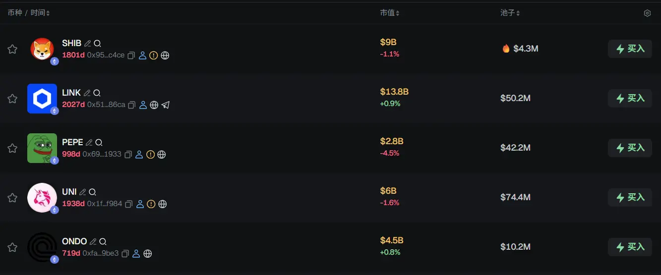 过去 24h ETH 热门代币前五依次为:SHIB、LINK、PEPE、UNI、ONDO