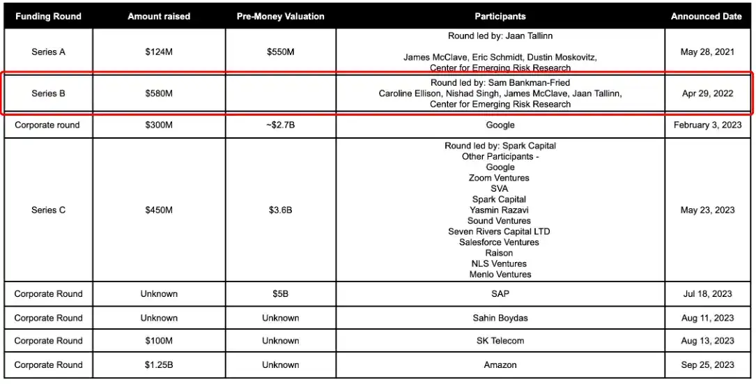 2022 年 4 月(此為官宣日期,交易實際完成於 2021 年),FTX 完成了在 AI 領域最關鍵的一筆投資—— 出資 5 億美元領投了 AI 新創 Anthropic 的 5.8 億美元融資,股權佔比一度高達 13.56%,之後隨著 Anthropic 陸續完成多輪融資而稀釋至 7.84%。