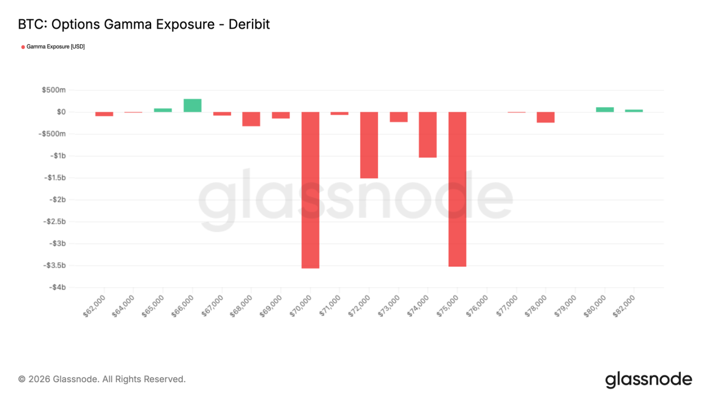 3 月 27 日星期五为周度、月度及季度期权合约的共同到期日,此类集中到期情形通常对比特币价格走势产生较大影响。随着期权市场规模持续扩大,做市商的对冲行为在短期内对价格的影响日益显著。当前距离到期日不足 48 小时,做市商整体处于短 Gamma 头寸状态,风险敞口集中在 70,000 美元至 75,000 美元区间。在此区域内,尤其在流动性相对偏薄的环境下,价格可能出现双向加速波动。