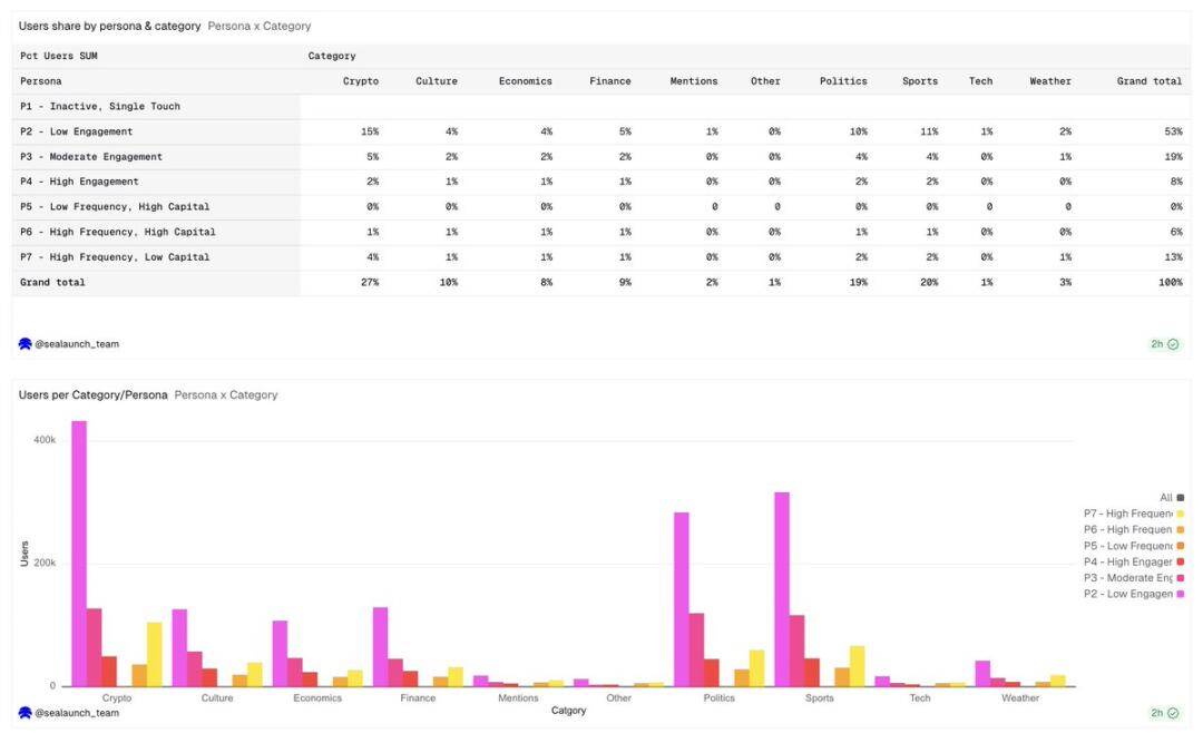 政治类用户占比最高,达 19%,但用户数量在各类用户群体中分布较为均匀。低参与度用户(P2)在政治类用户中的比例最高,与其他类别相比,这类用户通常是受事件驱动的一次性散户,他们注册账户是为了参与选举投注。