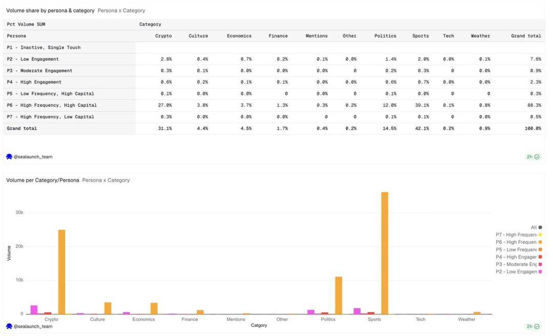 一个新的加密货币市场会吸引算法交易者和高频交易者;一个新的政治市场则会吸引受事件驱动的参与者,他们可能在事件结束后就再也不会回来了。像二元期权或结构化结果市场这样更特殊的市场形式,可能会进一步吸引高频高资本(P6)用户群体,而这些系统性交易者已经主导了加密货币市场。如果目标是交易量,那就面向 P6 用户群体构建。如果目标是用户增长和品牌影响力,那就面向 P2 用户群体构建。这两个目标需要截然不同的品类选择。