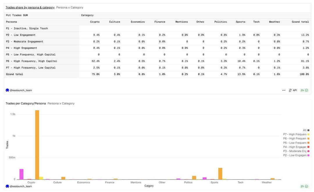 • P7 高频小额玩家:200 笔以上交易,总额不足 1 万美元,跃度高但资本有限的参与者