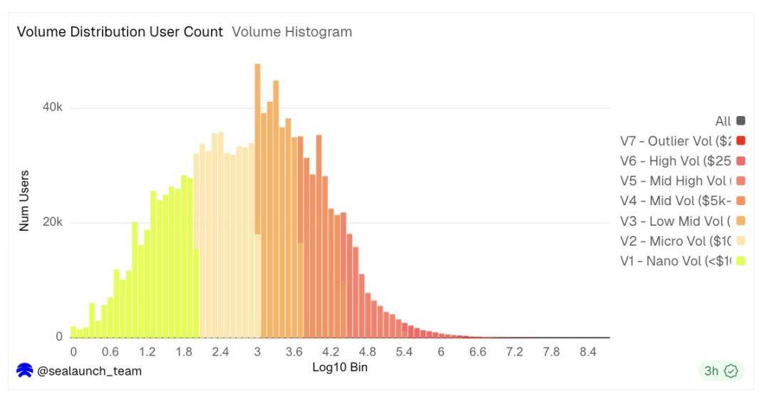 交易量分布则截然不同。虽然成交频率从左侧急剧下降,但成交量直方图在对数坐标系下呈钟形,峰值约为每位用户 600 至 3000 美元。这意味着典型的活跃用户交易额在四位数左右,但从 25000 美元开始的右尾用户数量较少,却占据了平台成交量的绝大部分。