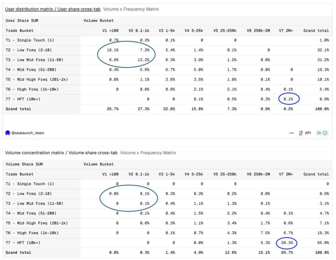 这两个直方图共同揭示了结构上的分裂:一部分是低频参与者;另一部分是高交易量参与者,他们在用户图表中的足迹几乎看不见,但他们对交易量图表的影响却占据主导地位。