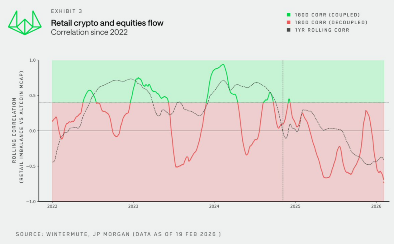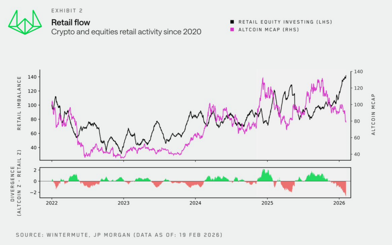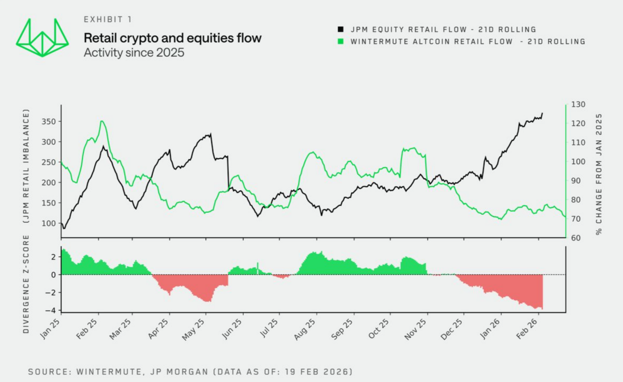 就在前不久,做市商 Wintermute 联合摩根大通(JPMorgan)发布最新散户资金流向研究,这也是首次将 Crypto 与美股的散户行为数据系统性地并排呈现,结果不出意料。