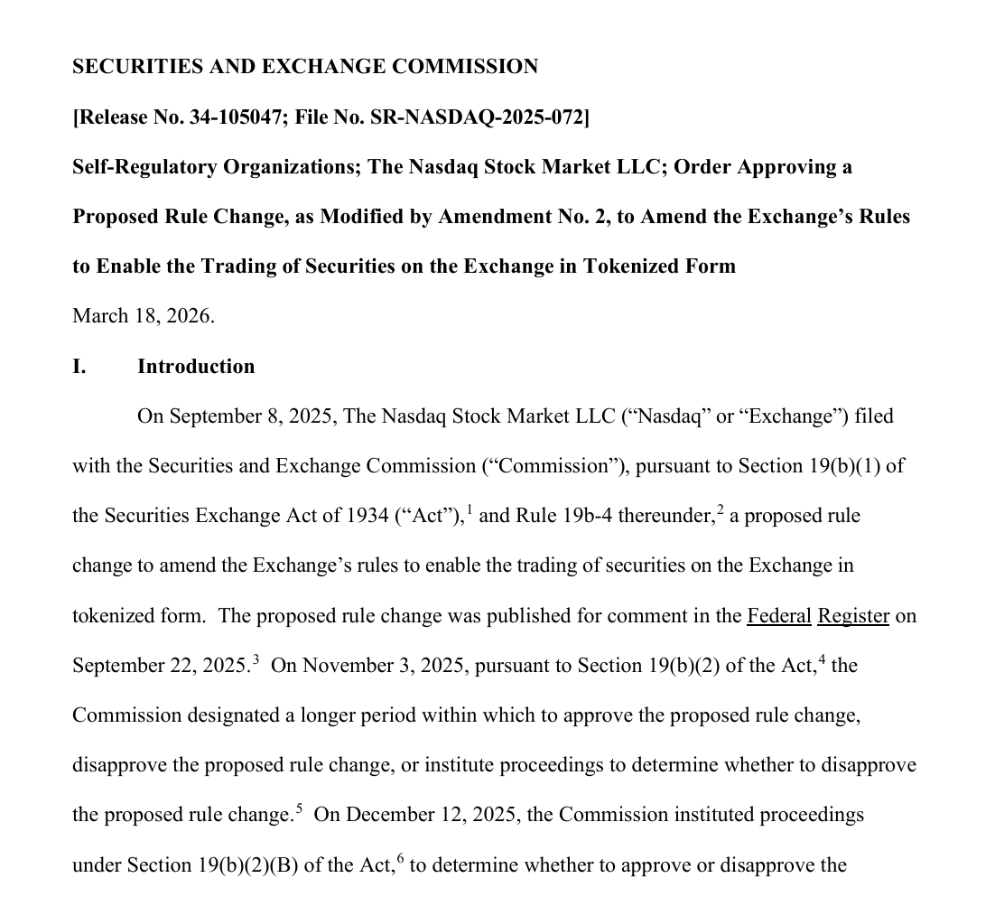 3 月 18 日,美国证券交易委员会(SEC)正式批准纳斯达克开展证券代币化交易试点,这意味着你熟悉的钱包、链上操作逻辑、稳定币结算路径,不再只服务于 Crypto 原生资产,也开始通向苹果、英伟达、特斯拉这样的全球核心权益资产。