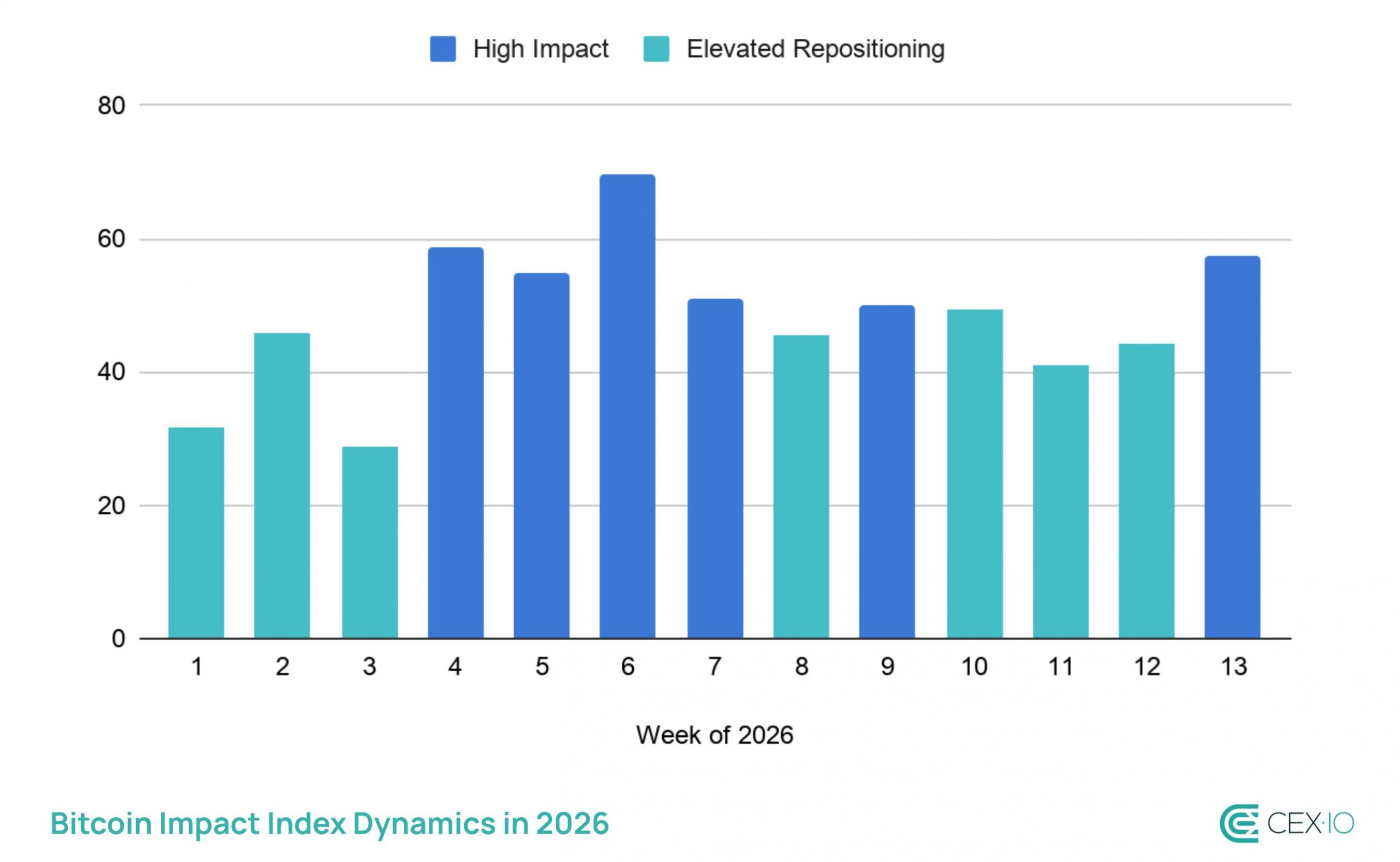 這項指數綜合了鏈上行為、ETF 與衍生品活動以及流動性流向。報告指出,57.4 這個數值已踏入歷史上的「高衝擊(High Impact)」區域。回顧 2018 年、2022 年以及今年早些時候,每當指標進入此區間,通常伴隨著兩位數的價格跌幅,甚至可能引發超過 25% 的深度回調。