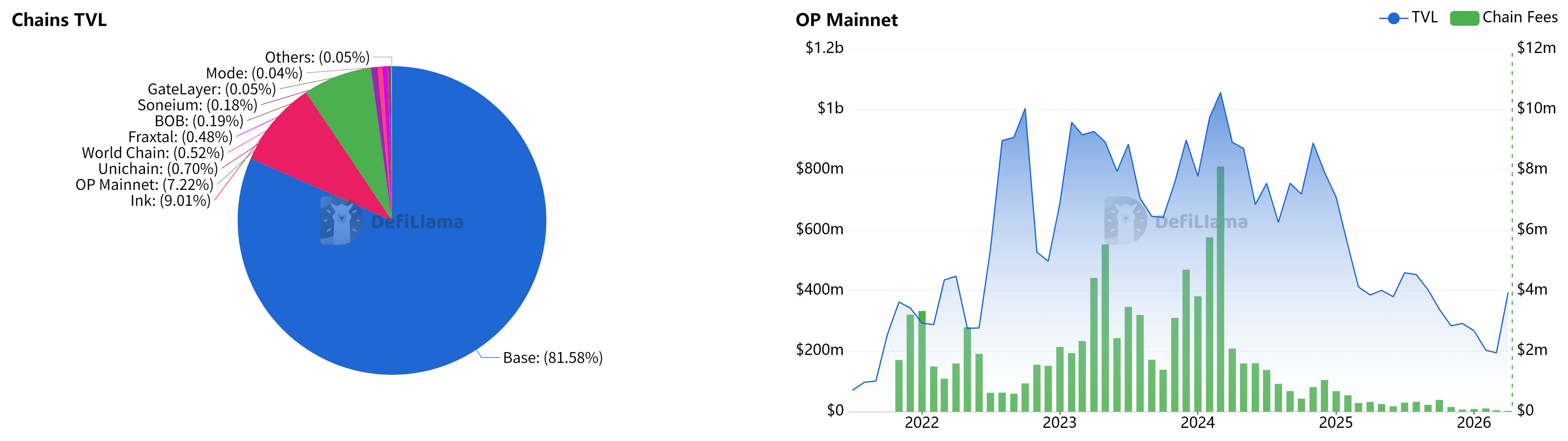 左:Superchain 各链 TVL 饼图 | 右:OP Mainnet TVL 及 Chain Fees(每月)