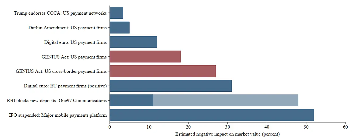 本文为加密资产能否在支付中发挥作用这一争论提供了前瞻性的实证证据。研究发现,美国稳定币立法使现有上市支付企业的市值累计下降约 18% ,这一影响略大于《德宾修正案》和数字欧元计划等其他监管冲击。