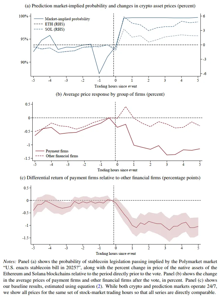 由于市场已部分预期法案通过,上述即时反应并非全部政策效果。作者采用Polymarket数据,显示投票前隐含概率约为93%、投票后接近100%。据此缩放,法案通过使上市支付企业总市值下降约18%,即3000亿美元左右。稳健性检验表明,这一结果在使用替代对照组、控制企业特征差异化趋势、调整事件窗口(4至48小时)、汇总全部五次立法投票,以及排除同日通过的另一项加密立法(H.R.3633)的干扰等条件下均保持一致。安慰剂检验也证实了结果的特异性。