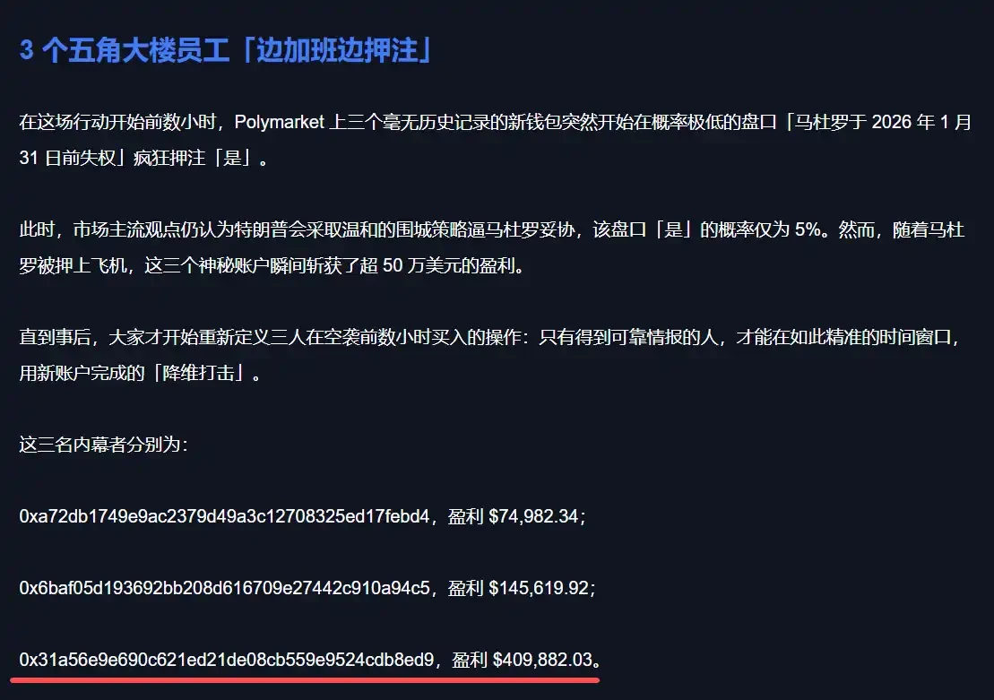马杜罗被捕事件发生后,PolyBeats 在事发后第一时间对链上数据进行了逐一拆解,锁定了 5 个账户,并在行动结束后不到 24 小时内完成了公开报道。详情请看 《他们错过 200 万美元,因为马杜罗本来不会在家里过年》