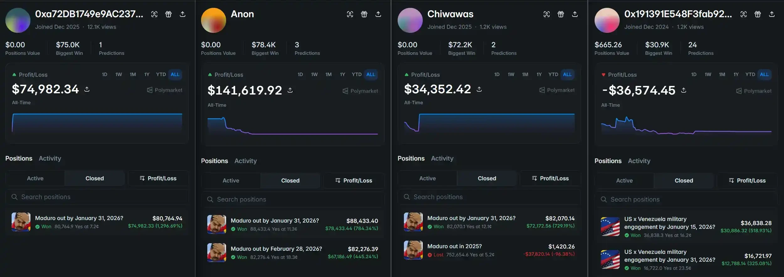 其中,Van Dyke 的账户是 5 个中获利最高的一个。账户于 2025 年 12 月 26 日注册,此后完成了一系列涉及「马杜罗下台」、「美军进入委内瑞拉」等与抓捕行动高度相关的押注,本金合计约 3 万美元,总获利超 40 万美元。