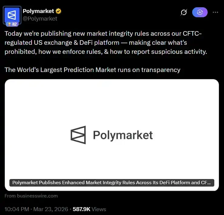 今年 3 月,Polymarket 发布了强化版市场诚信规则,明确禁止三类行为:基于法律要求保密的信息进行交易、基于他人内幕信息进行交易,以及由具有影响事件结果权力的人参与相关市场。规则落地的同时,这份来自 DOJ 的起诉书也在向所有人传递同一个信号:平台愿意配合调查,区块链上的记录不会消失,而调查本身可以持续数月。